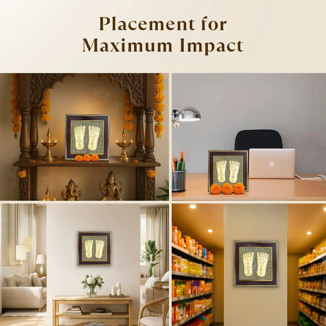 According to Vastu and spiritual beliefs, placing the Lakshmi Charan Frame helps attract financial growth, stability, peace, and positive energy, while reducing negativity and obstacles. It encourages prosperity in business, career, and household finances, making it ideal for homes, offices, shops, temples, and cash counters.